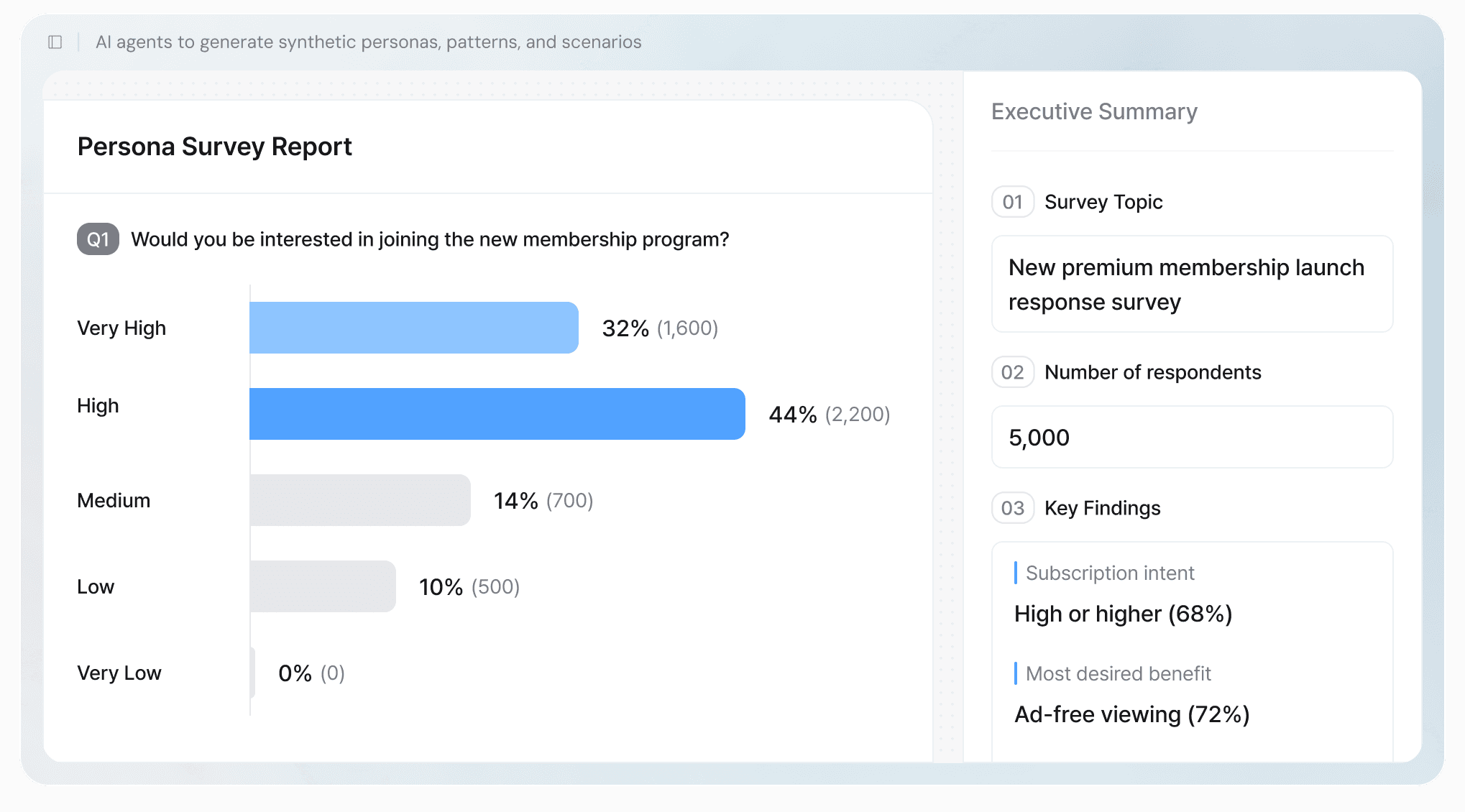Deploy AI agents to generate synthetic personas, patterns, and scenarios — and simulate outcomes that don’t exist in your data.