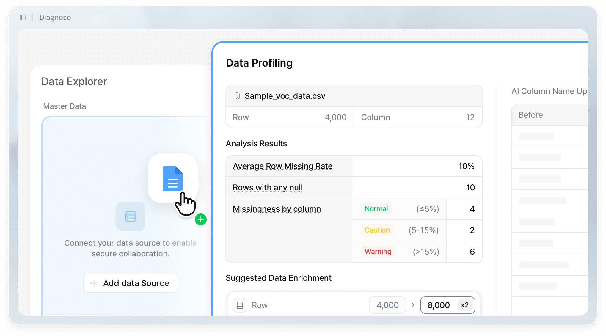 Automatically assess quality, structure, gaps, and bias across enterprise datasets — before analysis begins.